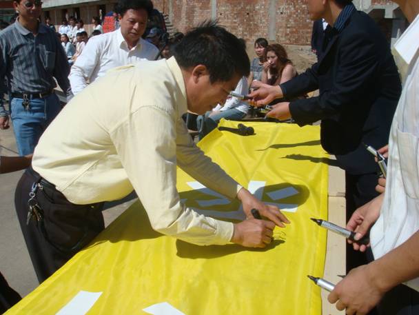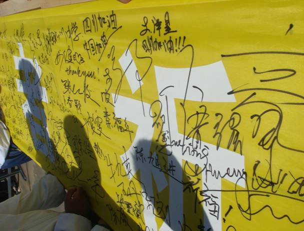 本次活動特邀張家口電視臺、張家口晚報進行宣傳報道。學院領導和高新區民政局有關領導親臨活動現場,陳院長代表學院講話并帶領全體人員向5.12大地震受難同胞表示哀悼,同時對廣大學生提出了殷切的希望和明確的要求。活動中還邀請到震后由我市大北車行安排就業的三十名來自四川德陽災區的受災同胞,他們與我系學生共同表演了《感恩的心》,并接受了我院和高新區民政局共同捐贈的慰問品,災區同胞因此倍感溫暖。隨之,在《讓世界充滿愛》的音樂聲中開始了“為生者祈福、為逝者哀悼”萬人簽名活動,由全校師生在長卷上獻出自己的愛心,送上自己對災區人民的祝福。