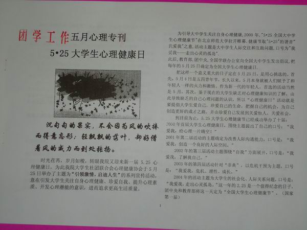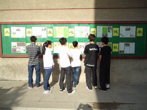 以畫報(bào)的形式在校園櫥窗布置了“陽光心態(tài),健康人生”大學(xué)生心理健康教育宣傳欄;從5月23日—26日每晚7:00開始在大階梯教室連續(xù)展播了全國著名心理學(xué)家孫健升教授在《師說》節(jié)目中的《陽光心態(tài)十二講》知識(shí)講座;青春緣夢(mèng)社編寫了《心海導(dǎo)航》刊物3期;5月25日中午心理健康協(xié)會(huì)在學(xué)生餐廳前舉行了“關(guān)愛自己的心靈,關(guān)注自己的健康”簽名活動(dòng);期間院團(tuán)委還請(qǐng)馮立群等教師開展了心理咨詢活動(dòng),并且通過開通心理咨詢熱線、QQ等形式來解答同學(xué)們心理健康問題,同時(shí)院團(tuán)委還借助心理健康網(wǎng)站來普及心理健康知識(shí),有效來提高大學(xué)生心理健康的維護(hù)水平。