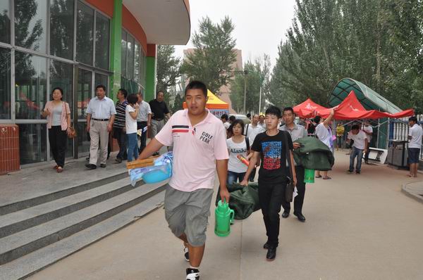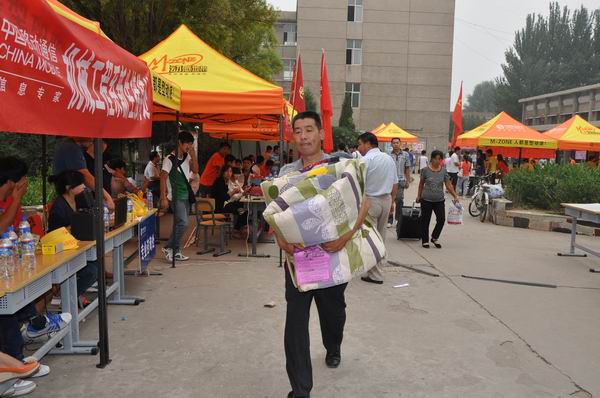 9月1日,我院新生開始報到。兩個大型的紅色拱門分別豎立在學院南北校門口,兩個紅色氫氣球高高懸掛在辦公樓前的廣場上,校園內道路兩旁插滿了彩旗,校園內到處懸掛著歡迎新同學的標語。新生接待處,工作人員和新生及其家長忙著辦理入學手續,整個場面歡樂、祥和。