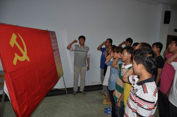 會上,剛加入黨組織的新黨員集體面向黨旗,在領誓人的帶領下莊嚴宣誓。