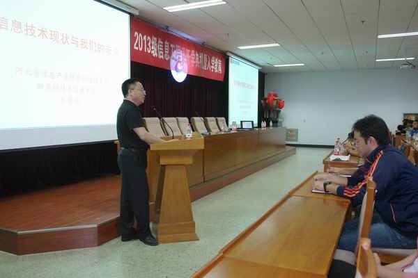 河北新龍集團董事長兼河北省信息產業與信息化協會執行會長杜秀珍,結合國際國內信息產業發展現狀和自己的親身經歷,對信息技術的現狀和未來做了深入全面的分析和講解,激勵同學們熱愛專業,刻苦鉆研,勤學善學,制定適合自己的學習目標和發展規劃,提高學習質量,努力成為專業知識扎實,專業技能過硬的合格的大學生。