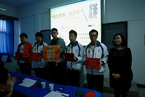 決賽于11月21日在礪能樓仿真實訓室舉行,共有夢想戰隊、素錦年華隊、青春隊、旌旗隊、龍之傳承隊和擼友之家隊等6支隊伍參加角逐。決賽沒有璀璨絢麗的舞臺,樸樸素素卻不失緊張激烈。賽制,寫錯一個詞即被淘汰;賽場,再神的選手也馬虎不得。現場,選手們向觀眾展示了中華漢字的魅力。比賽險象環生,有人改對,有人改錯。比賽中不斷有人離場,激烈的比賽讓觀眾們都為選手捏了一把汗。最后,經過激烈爭奪,夢想戰隊技高一籌摘得冠軍,旌旗隊技不如人屈居亞軍,素錦年華隊甘拜下風獲得季軍。