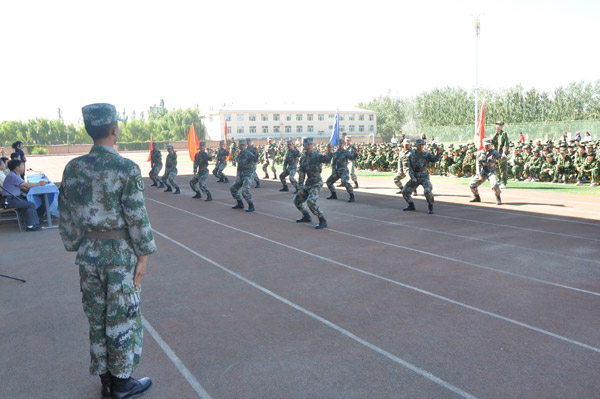 在熱烈的氣氛中,王立秋院長向軍訓團團長莊嚴授旗,在激情飄揚的團旗下,承訓部隊官兵為全體師生表演了精彩的軍事項目。至此,為期兩周的軍訓拉開了序幕。