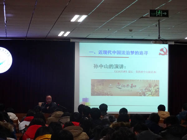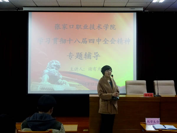 12月4日下午,學院黨委在綜合樓307報告廳學院舉辦了學生干部“學習貫徹十八屆四中全會精神”專題輔導報告會。社科部謝有光教授就如何強化法律意識、培養法治思維、提高法治素養等方面進行了專題輔導。學院紀委書記史慧武出席并主持報告會,全院學生干部近300人聆聽報告。