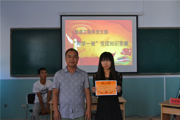 為進(jìn)一步落實(shí)“兩學(xué)一做”主題教育活動(dòng),信息工程系黨支部于6月15日在博學(xué)樓舉辦了以“黨團(tuán)在我心、青春獻(xiàn)祖國”為主題的“兩學(xué)一做”黨團(tuán)知識(shí)競賽。組織人事處副處長邵慧彬、信息工程系黨支部全體黨員及部分團(tuán)員參加活動(dòng)。