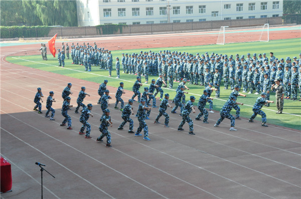 在激昂的《國歌》聲中,大會拉開帷幕。15個受閱方隊伴隨著《分列式進行曲》踏著整齊的步伐,依次通過主席臺,接受檢閱。同學們以飽滿的熱情、挺拔的軍姿、嘹亮的口號展示了這些天軍訓的成果,不斷贏得全場熱烈地掌聲。剛勁有力的軍體拳、列隊戰術演練將整個匯報表演推向了高潮。