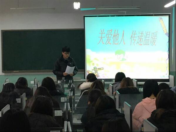 12月20日下午,應(yīng)用外語系在博學(xué)樓508教室召開“關(guān)愛他人傳遞溫暖”主題班會(huì)。應(yīng)用外語系團(tuán)總支書記張麗超,輔導(dǎo)員沈歡以及大一新生參加了本次班會(huì)。