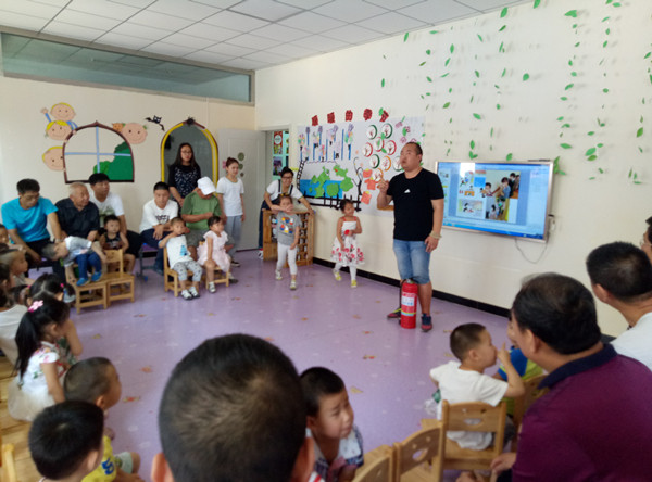 活動伊始,志愿者2016級會電3班的郭雅杰同學向小朋友及家長講解了幼兒在家庭和戶外方面的安全常識,并使用多媒體電視播放了自己制作的安全教育PPT,通過圖片、視頻的展示向小朋友們示范了如何防范火災、走失、溺水、地震等方面的安全問題。之后,王亞君老師補充講解了火災逃生和滅火器使用的問題和方法。