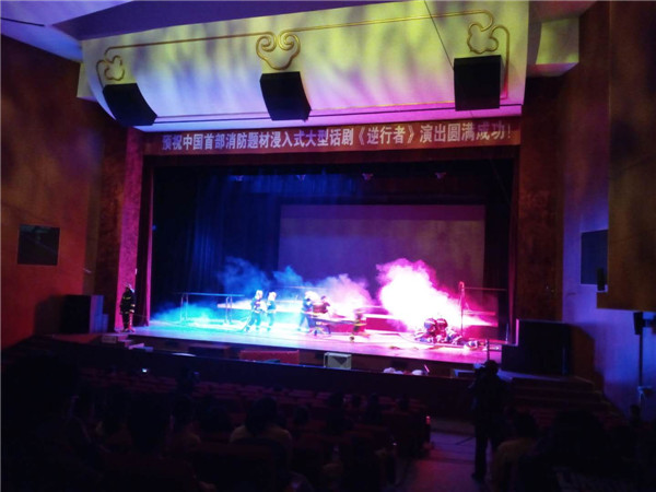 《逆行者》作為中國首部消防題材浸入式話劇,是張家口支隊結合全國“關注消防?平安你我”的消防宣傳主題,精心策劃制作而成。整部話劇時長1小時15分鐘,全景展現了消防部隊的執勤訓練、監督執法、滅火救援以及官兵的情感生活。逼真的舞臺效果、全新的視聽感受、感人的故事情節,使演出現場不斷爆發出一陣陣熱烈的掌聲。豐盛的消防文化大餐給現場學生們帶來歡笑的同時也令大家流下了感動的淚水。
