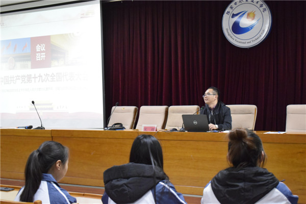 11月23日下午,經濟管理系組織學生300多人集中收聽十九大報告解讀,邀請學院社科部宋輝老師授課,經濟管理系黨支部書記郭獻崇主持,系部團總支書、各班輔導員參加。