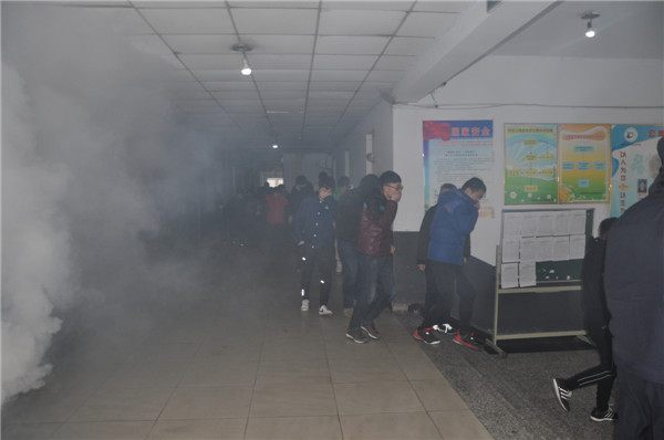 副院長宋德明任總指揮,安全工作處處長李建軍任現場指揮。宋院長宣布逃生演練活動開始,隨后煙霧彈發出的濃煙彌漫整座樓道,同時火警警報響徹整棟樓宇,學生們緊張、有序、快速的從公寓樓各個安全出口疏散撤離,并迅速到達食堂前籃球場集合。隨后安全工作處人員向在場的所有人員詳細地講解了滅火器的正確使用方法、注意事項,并在模擬火災現場,指導部分學生使用滅火器對現場大火進行撲滅,最后總指揮宋院長對整個活動進行了總結。