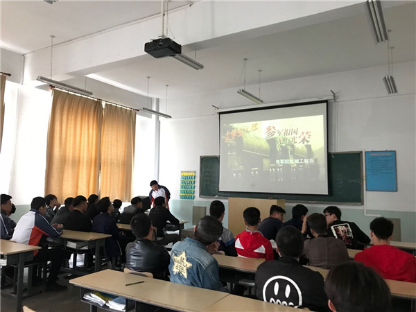 為積極做好大學生征兵工作宣傳,營造濃厚的征兵工作氛圍,充分激發適齡學生報名參軍的熱情,4月24日下午,張家口職業技術學院機械工程系舉行“參軍報國,無上光榮” 征兵宣傳主題教育活動,16、17級全體學生干部及學生代表等參加了此次活動。