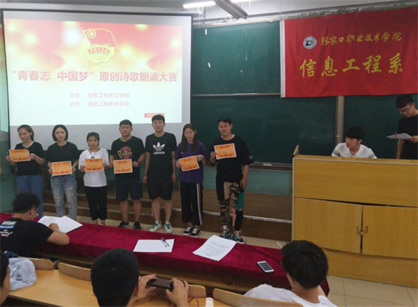 為更好宣傳中國夢(mèng)含義,鼓勵(lì)學(xué)生堅(jiān)定理想信念,錘煉高尚品格, 5月14日,信息工程系在博學(xué)樓舉辦“青春志 中國夢(mèng)”原創(chuàng)詩歌朗誦大賽。