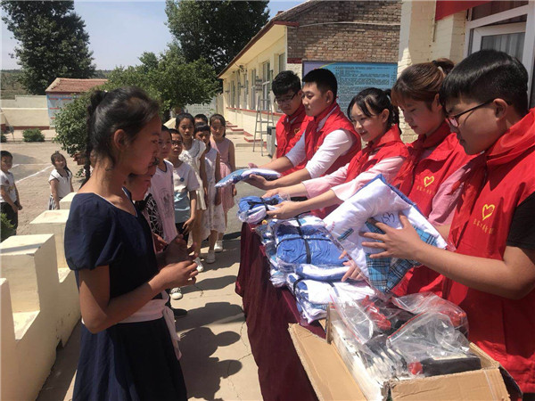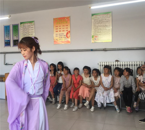 志愿者的到來受到了全校師生的熱烈歡迎。志愿者們?yōu)榇蠹耀I上精彩紛呈的文藝演出。節(jié)目和游戲穿插進行,場面歡快而熱烈。舞蹈《新月神話》以柔美多姿的肢體語言吸引了學生專注的目光,小品《開學了》風趣夸張的語言風格逗得孩子們開懷大笑,歌曲《童話》帶動全場師生共同合唱,搭建起大學生和新河口全體師生間友誼的橋梁。表演結束后,孩子們用稚嫩的小手為大哥哥大姐姐們系上了滿含深情的紅領巾。志愿者們則將26套夏季校服以及開展書法課所需的毛筆、墨汁、宣紙等交到學校負責人手中,祝福每一位小朋友永遠開心快樂,健康成長。
