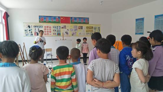 隨后,兩位教師走進教室,為學生們進行正式授課。柳建軍用生動有趣的語言為孩子們進行了樂理知識講解,帶領孩子們進行合唱訓練,每一個音符,每一個動作都進行細致入微的引導。孩子們注意力集中,認真聆聽,在老師的指導下漸入佳境,積極性極高。趙國翔為喜歡繪畫的學生講解了繪畫基礎知識,為孩子們示范了透視法在繪畫中的應用,并邀請了學生們參與到課程的講解、互動演示中,讓學生進行對比觀察,了解透視在繪畫中的作用和意義。大家聚集在趙老師的周圍,仔細地觀看和學習。