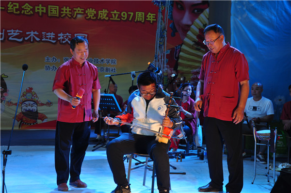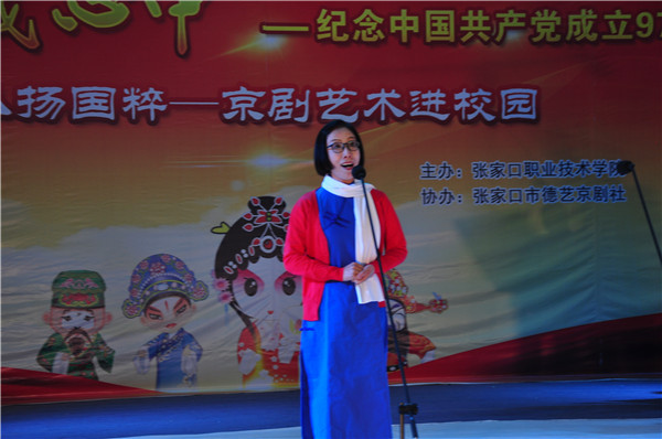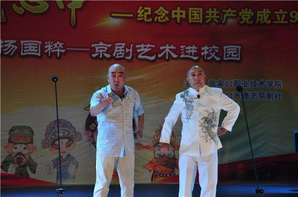 為慶祝中國(guó)共產(chǎn)黨97周年華誕,6月27日,由張家口職業(yè)技術(shù)學(xué)院主辦,張家口市德藝京劇社協(xié)辦的“黨在我心中—弘揚(yáng)國(guó)粹京劇進(jìn)校園”專場(chǎng)演出在師生活動(dòng)中心舉行。校領(lǐng)導(dǎo)胡煒、王立秋、宋德明與部分師生代表共同觀看演出。