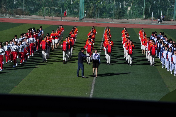 在莊嚴的國歌聲中校運會帷幕正式拉開。在國旗護衛隊和旗手的引領下,鼓樂方陣、彩旗方陣及各系部代表隊依次步入賽場,隊員們昂首挺胸,精神抖擻,步伐劃一,鏗鏘有力,展現出張職院學生青春澎湃、昂揚向上的精神面貌;由200多名學生組成的健美操代表隊獻上了精彩的健美操表演,學生們以健康、活潑、青春、靚麗的形象體現出了體育運動所倡導的“更高、更快、更強”的奧林匹克精神和不甘人后、奮勇爭先的拼搏精神;為我校屢次爭得榮譽的學院舞龍團隊壓軸出場,金色蛟龍在隊員們的的操作中動作千變萬化,時而似飛騰跳躍,時而似入海破浪,精彩的表演將全場氣氛推向高潮。