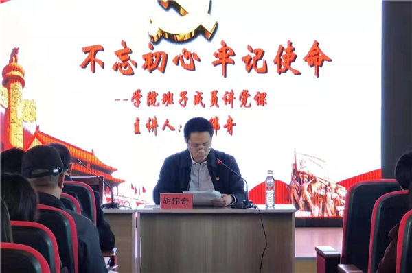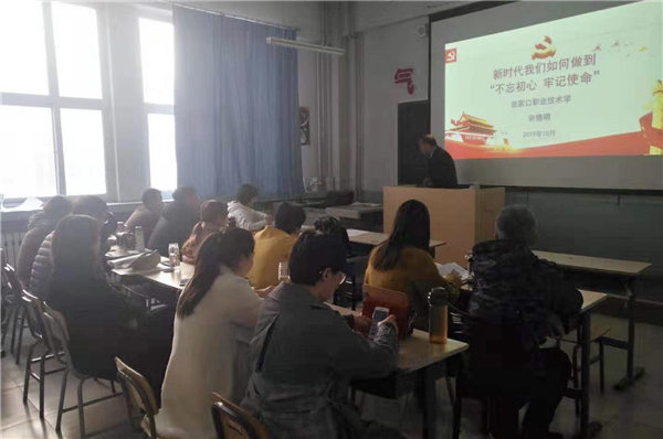 院長王立秋在行政綜合樓椅子網教室為行政一黨支部、汽車工程系黨支部全體黨員以及汽車工程系學生入黨積極分子作了題為《不忘初心 牢記使命 為建設特色鮮明的一流高職院校而奮斗》的黨課教育。