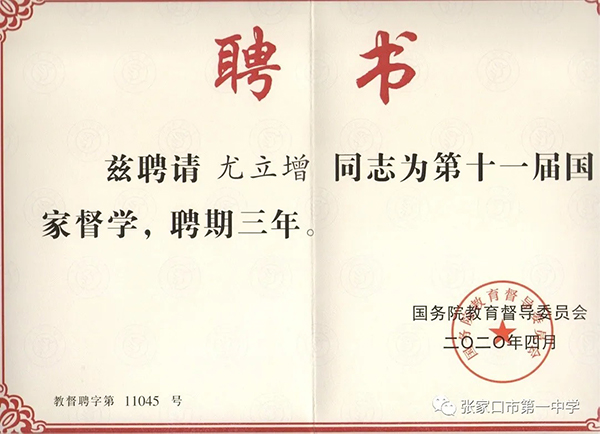 日前,國務院教育督導委員會辦公室印發(fā)了《關(guān)于聘任第十一屆國家督學的通知》,根據(jù)《教育督導條例》《國家督學聘任管理辦法(暫行)》和教育督導工作需要,經(jīng)地方推薦、教育部審定和公示,我院特聘導師、張家口市第一中學教師尤立增被聘為國家督學,聘期3年。