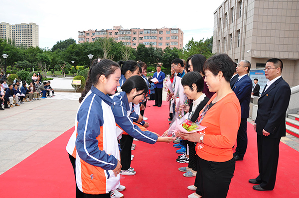 13名獲“疫情防控表現突出人員”獎教師、99名“從教三十年”優秀教師、40名2020學年度榮獲市級以上獎勵教師受到表彰。各系學生代表向受表彰人員及全體教職員工獻上了鮮花。