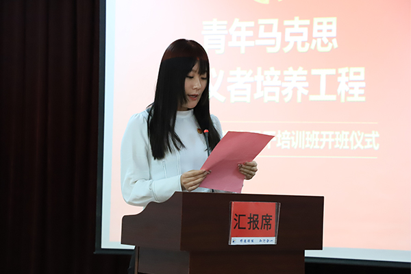 戎海廣為本次青馬培訓班授旗。學院團委副書記李婧語宣讀了“青馬工程”培訓班相關規章制度,就此次培訓目的、培訓對象、培訓形式、培訓要求及考核標準等做了說明。2018級應用外語系吳佳軒作為學員代表進行了發言。