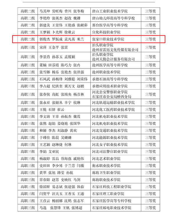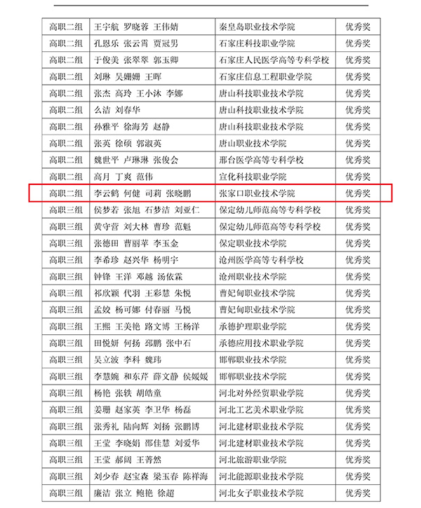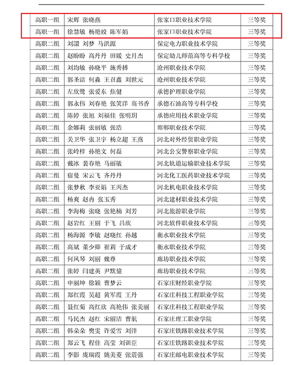 日前,河北省教育廳正式公布2020年河北省職業(yè)院校技能大賽教學(xué)能力比賽結(jié)果。在全省職業(yè)院校493支參賽團(tuán)隊(duì)中,我院六支參賽隊(duì)伍表現(xiàn)優(yōu)異,共奪得二等獎(jiǎng)一項(xiàng)、三等獎(jiǎng)四項(xiàng)和優(yōu)秀獎(jiǎng)一項(xiàng)。