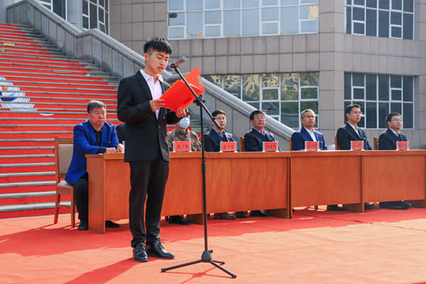 在河北省高職院校職業(yè)技能大賽教學(xué)能力比賽中榮獲團(tuán)體二等獎的土木工程系教師張麗敏、在河北省健美操錦標(biāo)賽中獲得大學(xué)組第一名和優(yōu)秀運(yùn)動員稱號的應(yīng)用外語系2019級學(xué)生邢甜夢、在大學(xué)期間參軍入伍并赴江西九江參加抗洪的土木工程系畢業(yè)生吳炳江、母親赴武漢參與抗擊新冠疫情工作的經(jīng)濟(jì)管理系2020級新生劉凱然和參訓(xùn)教官余祥祥分別代表優(yōu)秀教師、優(yōu)秀畢業(yè)生、2019級和2020級學(xué)生、軍訓(xùn)教官作了發(fā)言。