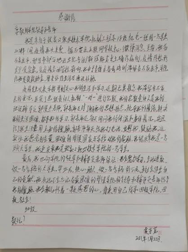 精準摸排過程中,學院特別注重對因疫情影響導致家庭經濟困難的學生進行深入排查,依據救助政策和上級文件精神,給予困難學生最大關懷和支持,實現精準救助、應助盡助。為緩解滯留學生經濟壓力,解除后顧之憂,學院向105名學生分別發放了300元、600元不等的臨時救助金,共計總額3.57萬元,幫助滯留學子們度過困難期,真正讓學生們體悟到了親人般的溫暖。