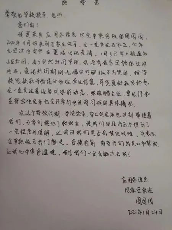 目前,我院滯留石家莊的105名學生心理與思想穩定,生活無憂,大家對學院各級給予的關心關愛表示感謝,對戰勝疫情充滿信心。同時,學院也將持續關注滯留學生的身心健康和生活情況,繼續開展有溫度、有力度、有深度的幫扶活動,全力幫助學生們順利渡過難關,共同打贏疫情殲滅戰。