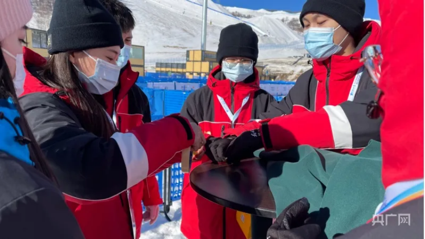 ????這次測試活動是白天晚上都有比賽。每場比賽前金銘鈺和志愿者們都要勘察場地、規(guī)劃路線、分配人員、確定位置;他們要在光滑的雪地里搬運(yùn)百公斤重的頒獎臺;還要對現(xiàn)場所有的物資進(jìn)行全面消毒,再擺放整齊……而且這些工作都必須在比賽間歇以最快的速度完成。每一場比賽,志愿者們都要在寒風(fēng)中站立三四個(gè)小時(shí),他們身上和腳底的暖貼都沒了溫度,雙腿麻木至沒有知覺,全身都凍透了,眼睛被白雪刺激的酸痛流淚,而且崇禮的紫外線很強(qiáng),幾天下來,金銘鈺和志愿者們都變成了“口罩臉”。但他們不說一句苦,不喊一句累,大家都以最飽滿的熱情、最專業(yè)的水平、最溫暖的服務(wù),默默地做著看似微不足道的事情。
