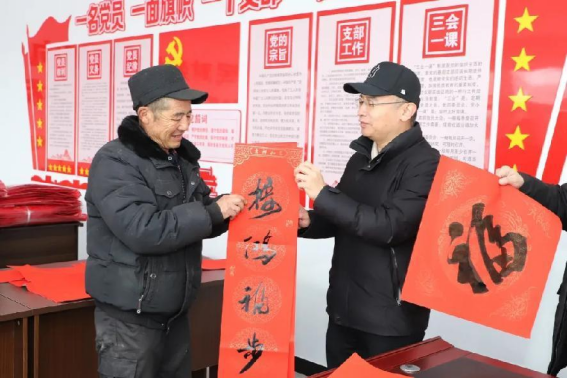隨后,王立軍又來(lái)到了北新屯鄉(xiāng)馬蓮灘村。春節(jié)臨近,村委會(huì)內(nèi)洋溢著喜悅歡樂(lè)的氣氛,駐村工作隊(duì)員正與村干部一起為全村每家每戶(hù)題寫(xiě)春聯(lián)。王立軍向村民代表贈(zèng)送了剛剛書(shū)寫(xiě)好的春聯(lián),并同村民代表進(jìn)行交談,了解了他們的身體健康、家庭收入等基本情況,勉勵(lì)他們保持昂揚(yáng)向上的生活態(tài)度,通過(guò)勤勞的雙手和大家的共同努力,創(chuàng)造更加幸福美好的新生活。