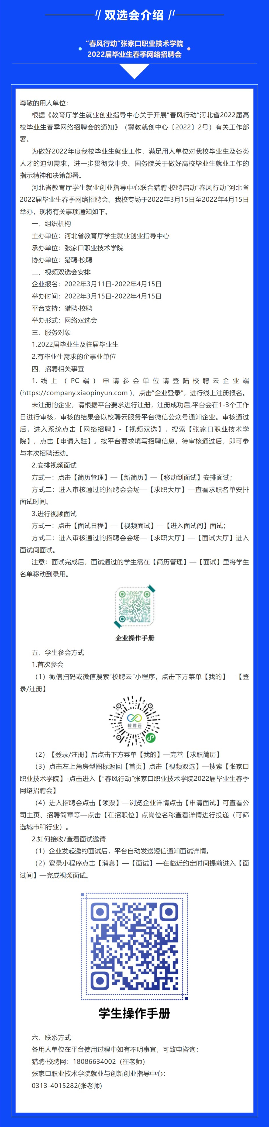 “春風行動”張家口職業技術學院2022屆畢業生春季網絡招聘會邀請函