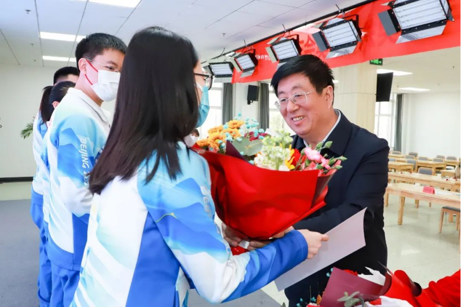 大會結束后,馮印濤代表學院黨委向學院參與冬奧服務的我院師生志愿者代表贈送了鮮花。