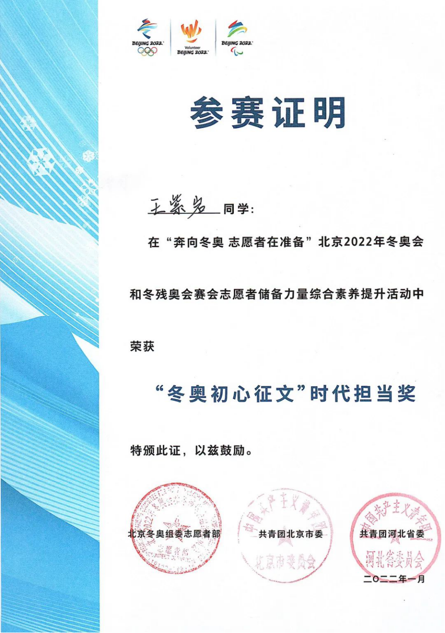 近日,在由北京冬奧組委志愿者部、北京團市委、河北團省委共同舉辦的“奔向冬奧 志愿者在準備”賽會志愿者儲備力量綜合素養(yǎng)提升活動中,經(jīng)綜合考核評定,我院與清華大學(xué)等27所總體組織情況較好、成績突出的高校被授予“優(yōu)秀組織獎”。同時,來自機電工程學(xué)院的學(xué)生王紫巖在“冬奧初心征文”比賽中榮獲“時代擔(dān)當(dāng)獎”。