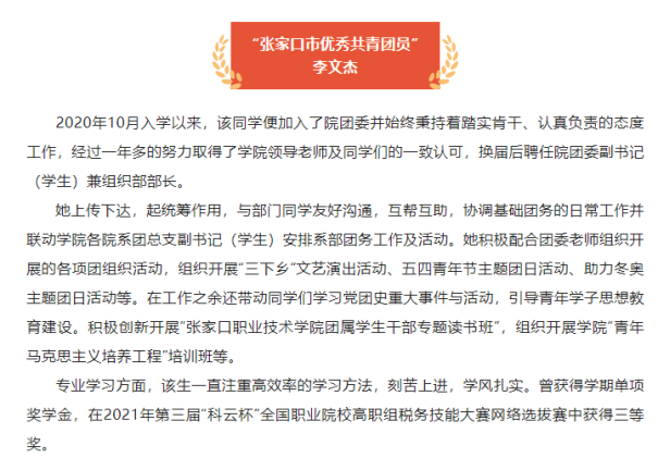 青春心向黨、建功新時代。日前,共青團張家口市委印發《關于選樹2021年度全市“五四紅旗團委(團支部)”“優秀共青團員”“優秀共青團員干部”“新長征突擊手”事跡典型的決定》。我院信息工程與藝術設計學院團總支榮獲“張家口市五四紅旗團支部”稱號;2020級團屬學生組織干部李文杰榮獲“張家口市優秀共青團員”稱號;學院團委副書記夏樹森榮獲“張家口市優秀共青團干部”稱號;專任教師李月婷榮獲“張家口市新長征突擊手”稱號。