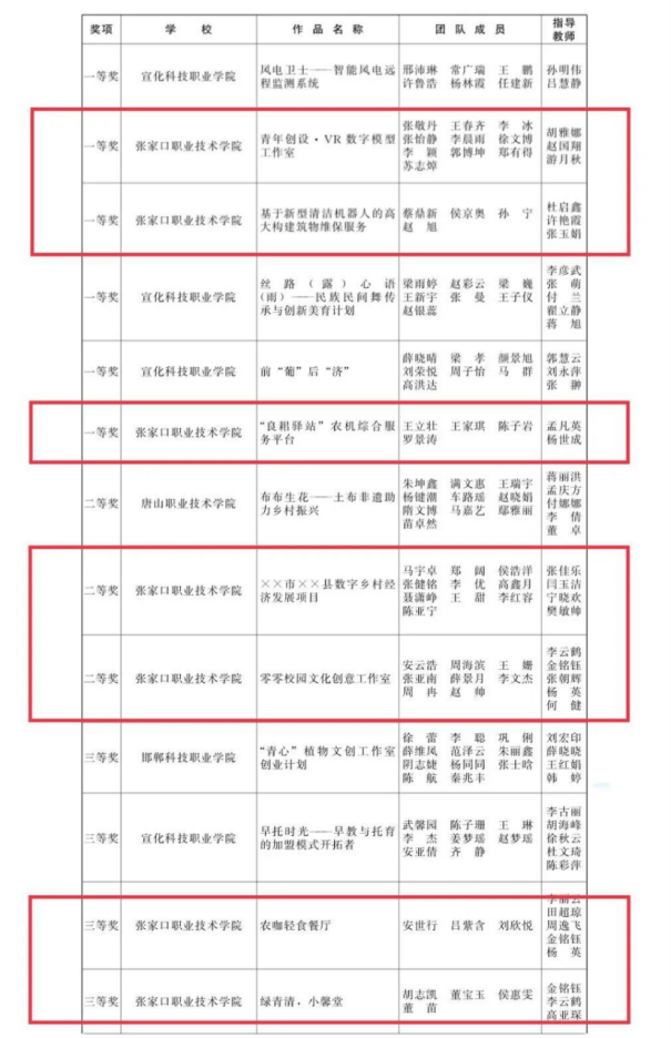 其中,《青年創設·VR數字模型工作室》《“良耜驛站”農機綜合服務平臺》《基于新型清潔機器人的高大構建筑物維保服務》榮獲一等獎;《xx市xx縣數字鄉村經濟發展項目》《零零校園文化創意工作室》榮獲二等獎;《農咖輕食餐廳》《綠青清,小馨堂》榮獲三等獎。