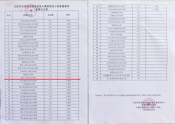 8月15日至8月18日,2022年全國職業(yè)院校技能大賽高職組“工程測(cè)量”賽項(xiàng)在云南交通職業(yè)技術(shù)學(xué)院隆重舉行。由土木工程系牛路恒、倪辰旭、馬秋龍、仝杰四名同學(xué)組建的我院參賽隊(duì)伍與來自全國各高職院校的56支參賽隊(duì)伍同臺(tái)競(jìng)技,并在激烈角逐中脫穎而出,斬獲全國職業(yè)院校技能大賽上三等獎(jiǎng)。
