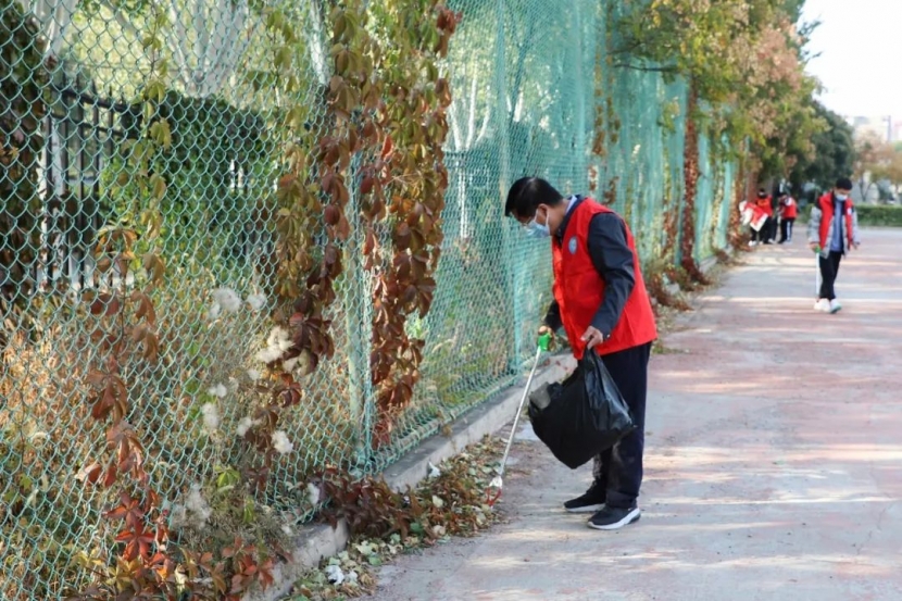 在了解到師生們開展的垃圾撿拾志愿活動后,黨委書記馮印濤主動參與到校園生活垃圾清理工作中,身著紅色志愿者馬甲,與學生們分組開始進行垃圾撿拾清理。大家協作配合,認真負責地對責任區域進行清理,對撿拾的各類垃圾清理打包,并及時將打包完的生活垃圾投入到垃圾收集箱內。