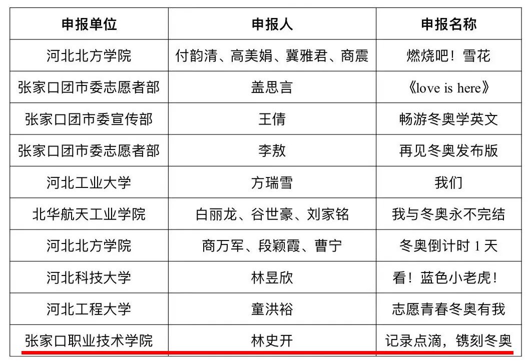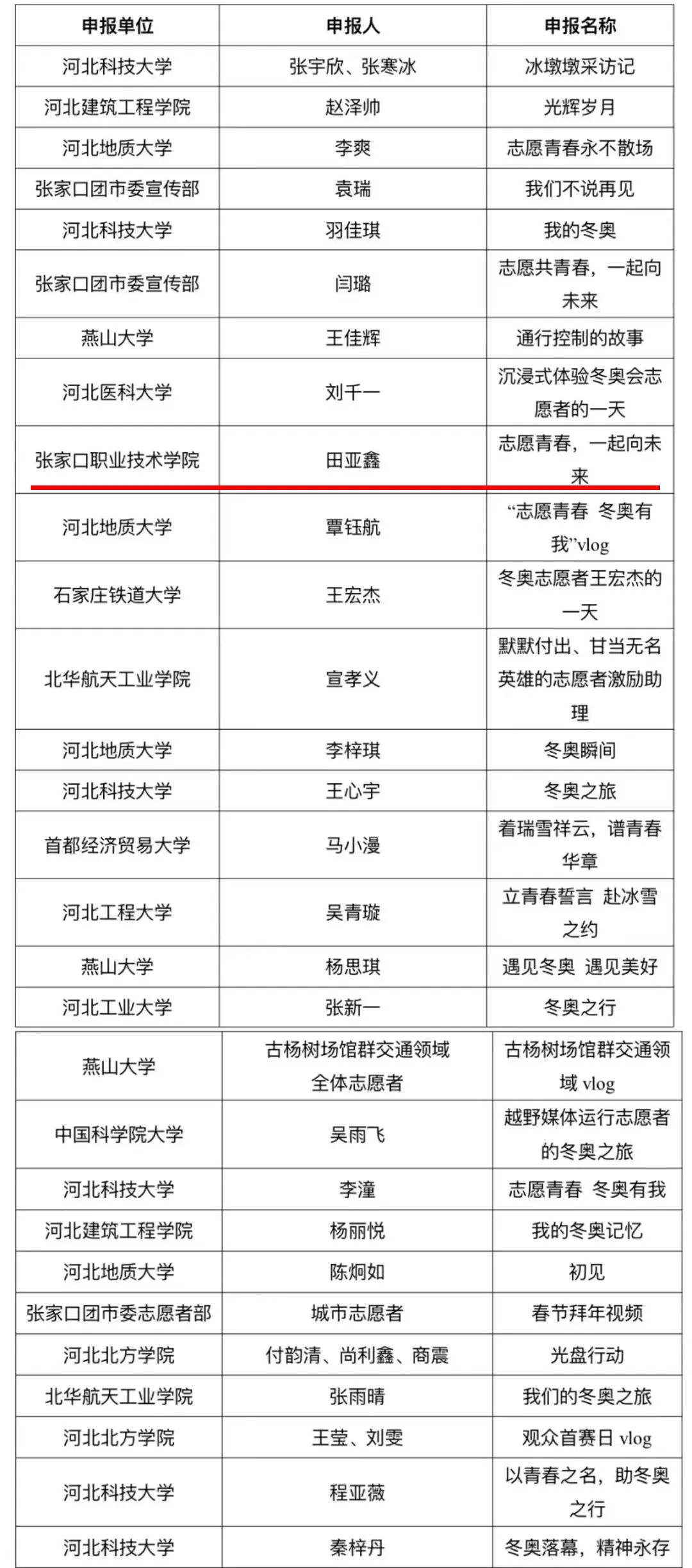 日前,由共青團河北省委開展的“志愿青春 冬奧有我”vlog短視頻征集活動評審結(jié)果揭曉,我院共有2項作品獲獎。其中,短視頻《記錄點滴,鐫刻冬奧》(申報人:林史開)榮獲一等獎,短視頻《志愿青春,一起向未來》(申報人:田亞鑫)榮獲三等獎。