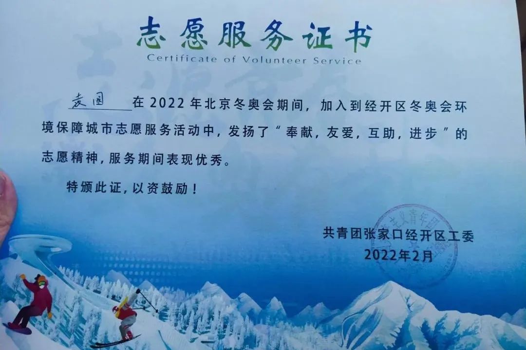利用寒假期間,加入了經(jīng)開區(qū)冬奧會環(huán)保志愿服務(wù)的活動,并獲評“經(jīng)開區(qū)冬奧會環(huán)保志愿服務(wù)優(yōu)秀服務(wù)者”。