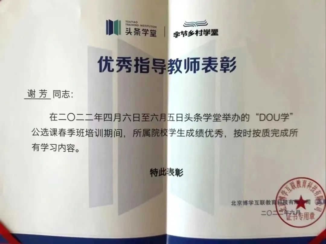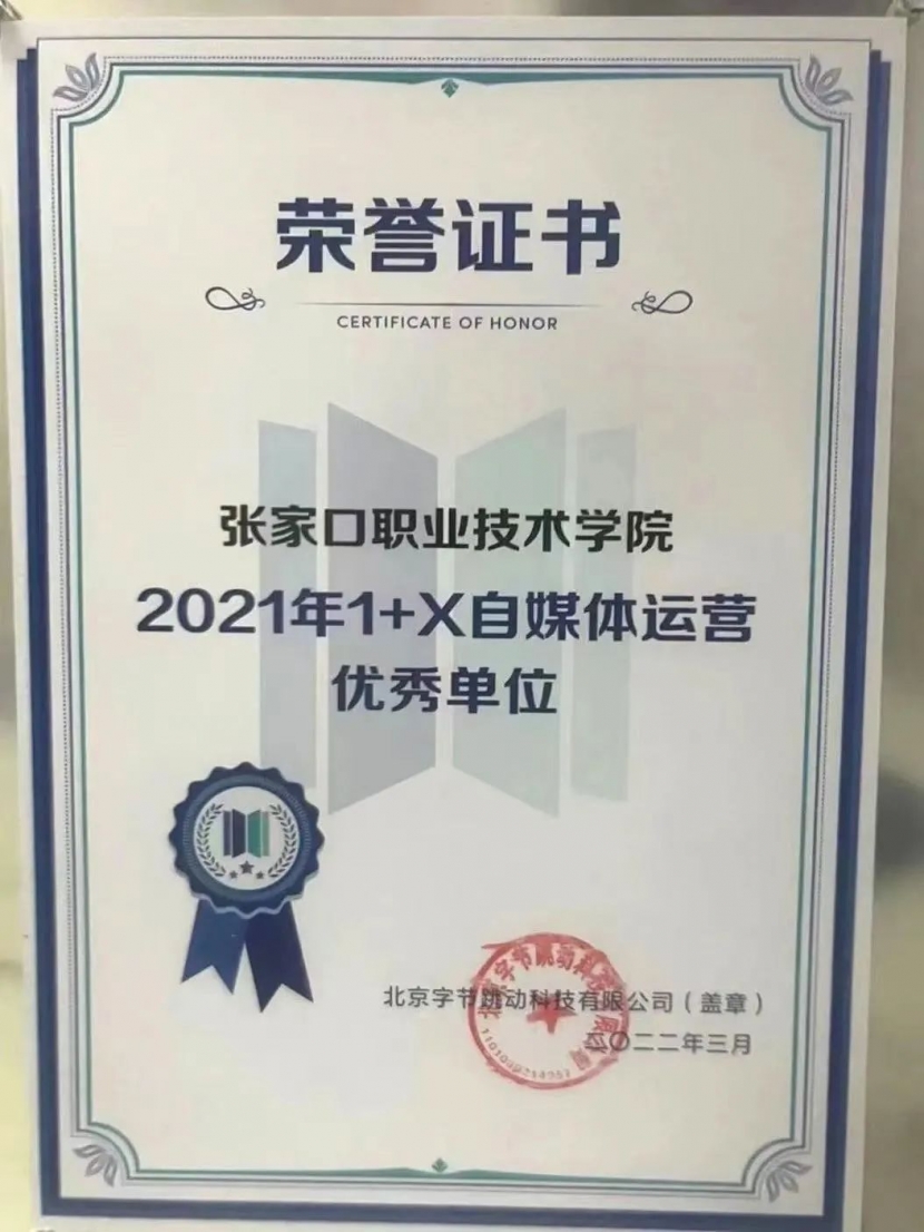 集中力量開展Web前端開發、游戲美術設計、自媒體運營三項證書考核工作。2021年,1+X游戲美術設計考試通過率為94%,1+X自媒體運營(中級)通過率達到100%。教學團隊成績突出,被北京字節跳動公司授予優秀教學成果獎和“優秀教師”稱號。