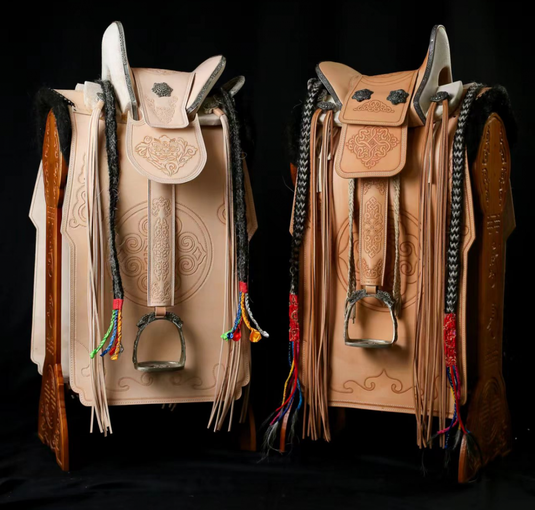 《國泰民“鞍”》創作歷時九個多月,作品在承襲東口鞍傳統技藝的同時,將現代藝術設計融入其中,既保留了傳統特征,又兼具當代審美。作品使用了樺木、植鞣牛皮、黃貂魚皮(生皮)、蛇皮、銀、白銅在內的十余種材料,并運用鞍杈砍制、皮革雕刻、奶熟皮、硝熟皮、鏨銀、黃貂魚皮蒙制、馬鬃編織等十余項傳統技藝,盡顯東口鞍加工技藝精髓,彰顯了精致奢華的藝術風格。
