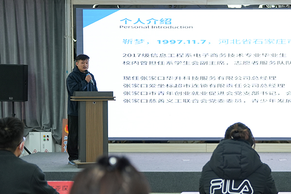 20屆優秀畢業生代表、張家口華升科技服務有限公司總經理靳夢也受邀參加活動,并圍繞個人創業歷程、公益歷程、職業思考等幾方面內容與在場師生分享了創業經歷和經驗。