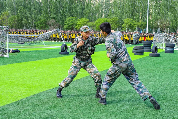 擒敵拳術方隊展示中,同學們進行了拳術表演,展示了能攻能守、攻防結合的綜合性徒手格斗技能,也展現出青年大學生戰驕陽、歷風雨,不怕苦、不怕累的精神風貌。