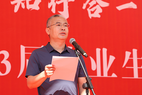 黨委副書記、院長王立軍以《做永遠向上的青年》為題親切寄語2023屆畢業生。他代表學院全體師生員工,向2023屆畢業生表示熱烈祝賀和美好祝福,向悉心培育、細心呵護張職學子成長成才的老師們致以崇高的敬意。他強調,同學們在大學校園里見證了黨的二十大勝利召開、中國共產黨百年華誕、新中國成立70周年等偉大盛事,親歷了實現全面建成小康社會的偉大壯舉。作為黨的二十大后第一批畢業的大學生,2020級學子將投身全面推進中華民族偉大復興的新征程,為實現中國式現代化的宏偉藍圖貢獻青春力量。無論是走向工作崗位,還是選擇繼續深造,希望每一位畢業的同學,都能夠堅持學習新知識,不斷磨礪自己,不斷豐富自己,筑牢適應時代之變的強大根基。作為新時代的大學生,一是要明德礪志、愛國奉獻。要始終堅守崇高的理想信念,常懷感恩之心、厚植家國情懷,永擔將“小我”融入“大我”的強國使命。秉持“修德礪能、知行合一”的校訓,努力成為卓越工程師和大國工匠,在更大的舞臺上書寫美好樂章,為全面建設社會主義現代化國家貢獻青春力量;二是要心存憂患、直面挑戰。面對“百年未有之大變局”,“危”與“機”總是同生并存的,只有常懷憂患意識,居安思危,認清危中之需,搶抓發展之機,才能做到未雨綢繆,應對各種挑戰,才能在今后各自崗位的方寸之地繪就大寫人生;三是要勤學深思、銳意創新。面對快速而深刻的變革,要積極適應時代之變,跳出“舒適圈”,堅持終身學習,樹立創新思維,才能更好地有所創造、有所作為,才能在發展中不斷進步,超越自我。才能真正肩負起新時代賦予的使命,心懷“國之大者”,用青春和智慧書寫精彩的人生答卷。