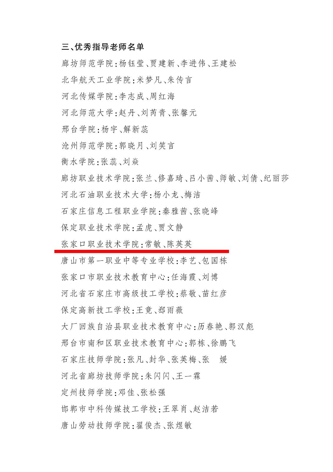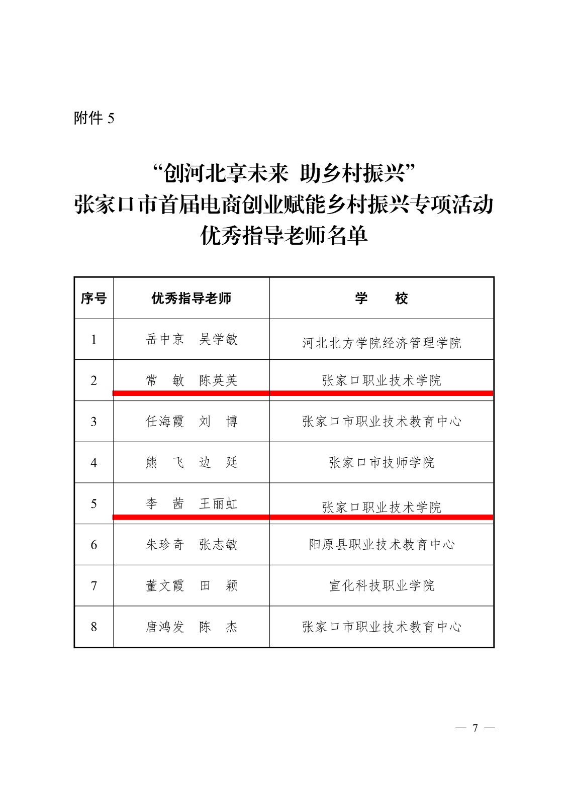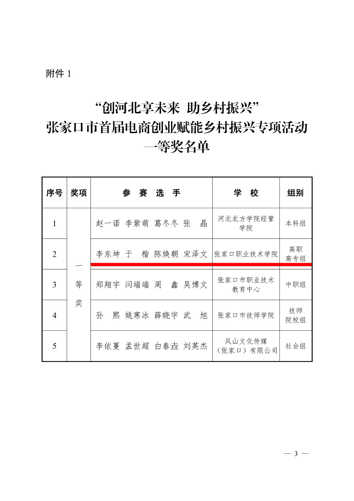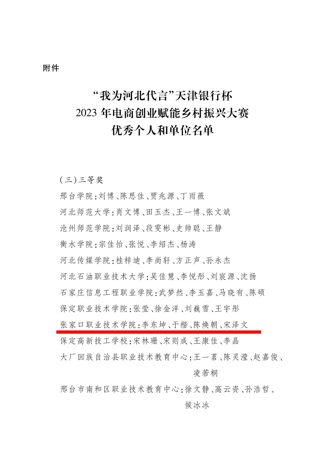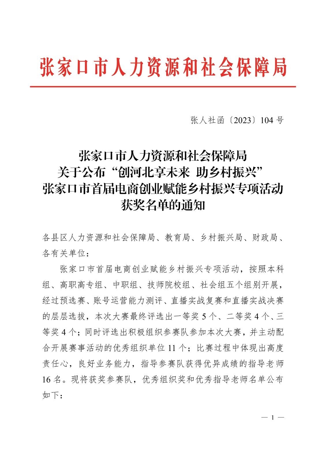 近日,河北省人力資源和社會(huì)保障廳、河北省鄉(xiāng)村振興局、張家口市人力資源和社會(huì)保障局公布了河北省第二屆“我為河北代言” 電商創(chuàng)業(yè)賦能鄉(xiāng)村振興大賽獲獎(jiǎng)名單和“創(chuàng)河北享未來(lái) 助鄉(xiāng)村振興” 張家口市首屆電商創(chuàng)業(yè)賦能鄉(xiāng)村振興專項(xiàng)活動(dòng)的獲獎(jiǎng)名單。我院獲得省賽三等獎(jiǎng)一項(xiàng),市賽一等獎(jiǎng)一項(xiàng)、二等獎(jiǎng)一項(xiàng)、優(yōu)秀獎(jiǎng)兩項(xiàng),優(yōu)秀指導(dǎo)教師四名。