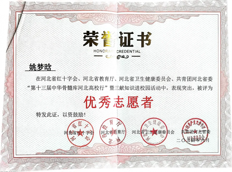 近日,在由河北省紅十字會、河北省教育廳、河北省衛(wèi)生健康委員會、共青團河北省委共同主辦的“第十三屆中華骨髓庫河北高校行”暨“三獻”知識進校園活動總結表揚大會落下帷幕。大會對“河北高校行”活動中優(yōu)秀志愿服務組織及優(yōu)秀志愿者進行表彰。我院校學生會主席劉治澤,青年志愿者服務隊隊長姚夢晗、副隊長袁聰聰榮獲“優(yōu)秀志愿者”榮譽稱號。