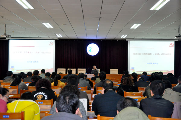 謝教授由如何理解和學習領會依法治國,進而延伸到實踐依法治校,并結合學院實際,分別從依法治校的內涵、依法治校的動因以及部署等方面進行了深入細致的闡述,通過對具體案例的分析,使與會人員能夠清楚地理解和領會依法治校的重要性和必要性。