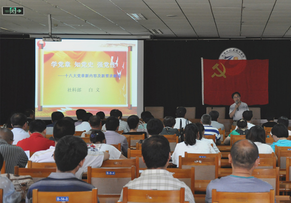 白義教授以“學黨章、知黨史、強黨性”為題從四方面對新黨章的修改及內容進行了解讀。一是從最基本的層面闡述了黨章內涵、地位以及作用;二是黨章修改的原因及背景,論述了黨章修改的必要性;三是對黨章修改歷史的回顧,使全體黨員對黨章的發(fā)展有了更深刻的認識;四是詳細解讀了十八大對黨章六個方面的修改以及修改之后的新內容和新要求。