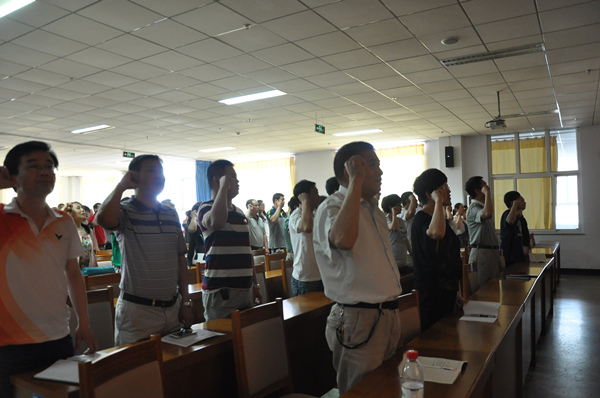 在對新黨章解讀之前,由白義教授領誓,新黨員代表和全體黨員一起面向黨旗,舉起右手莊嚴宣誓。新黨員入黨宣誓,老黨員重溫入黨誓詞,渾厚響亮的聲音,表達了共產黨人堅定的信念和必勝的決心。